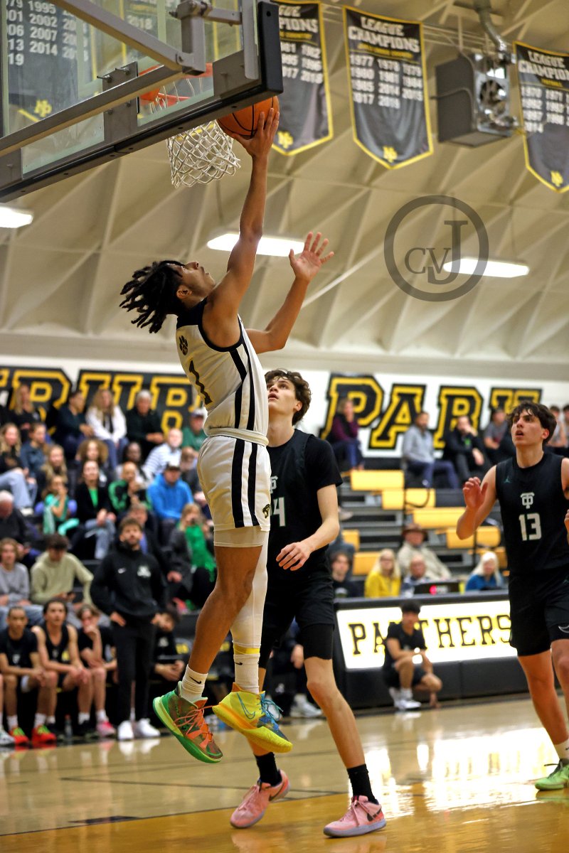 Newbury Park senior Blake Jones puts the ball up during their game against Thousand Oaks on Thursday, February 1. Thousand Oaks won 83-44 making them co-Marmonte Boys Basketball League Champions with Westlake High and Oaks Christian.
