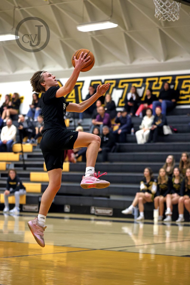 Thousand Oaks senior Garrett Powell puts the ball up during their game against Newbury Park on Thursday, February 1. Thousand Oaks won 83-44 making them co-Marmonte Boys Basketball League Champions with Westlake High and Oaks Christian. [Richard Gillard/Conejo Valley Journal]