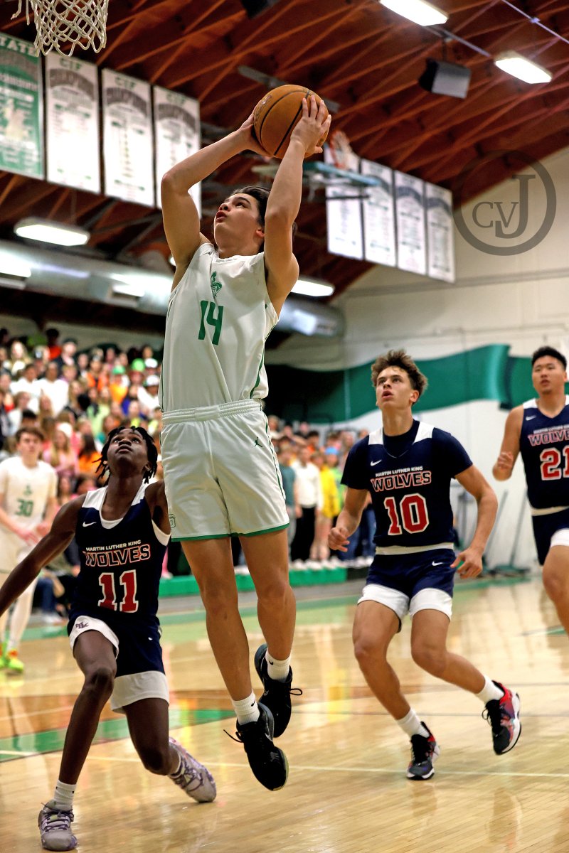 RG 104 Thousand Oaks sophomore Gabriel Chin puts the ball up during their 2024 CIF-SS Boys’ Basketball Division 2AA playoff game against King at Thousand Oaks High School on Wednesday, February 7. Thousand Oaks won 66-51 advancing in the playoffs. [Richard Gillard/Conejo Valley Journal]