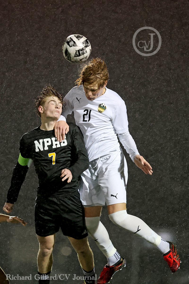 Newbury Park senior Dragen Vrataric and Thousand Oaks sophomore Grant Weeks jump to heads the ball during their conference game on Tuesday, February 4, 2025. Thousand Oaks won 4-1. [Richard Gillard/Conejo Valley Journal]