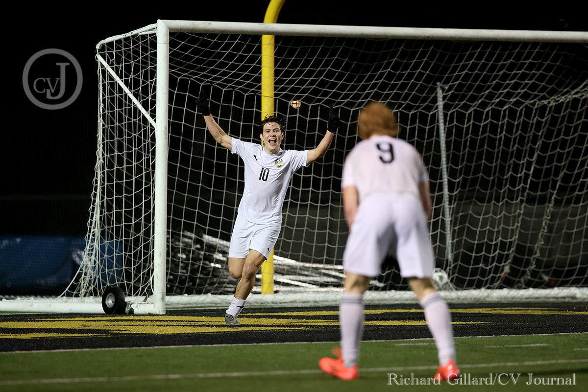 Thousand Oaks senior Gabriel Torreblanca throws up his arms after scoring a goal during their conference game against Newbury Park on Tuesday, February 4, 2025. Thousand Oaks won 4-1. [Richard Gillard/Conejo Valley Journal]