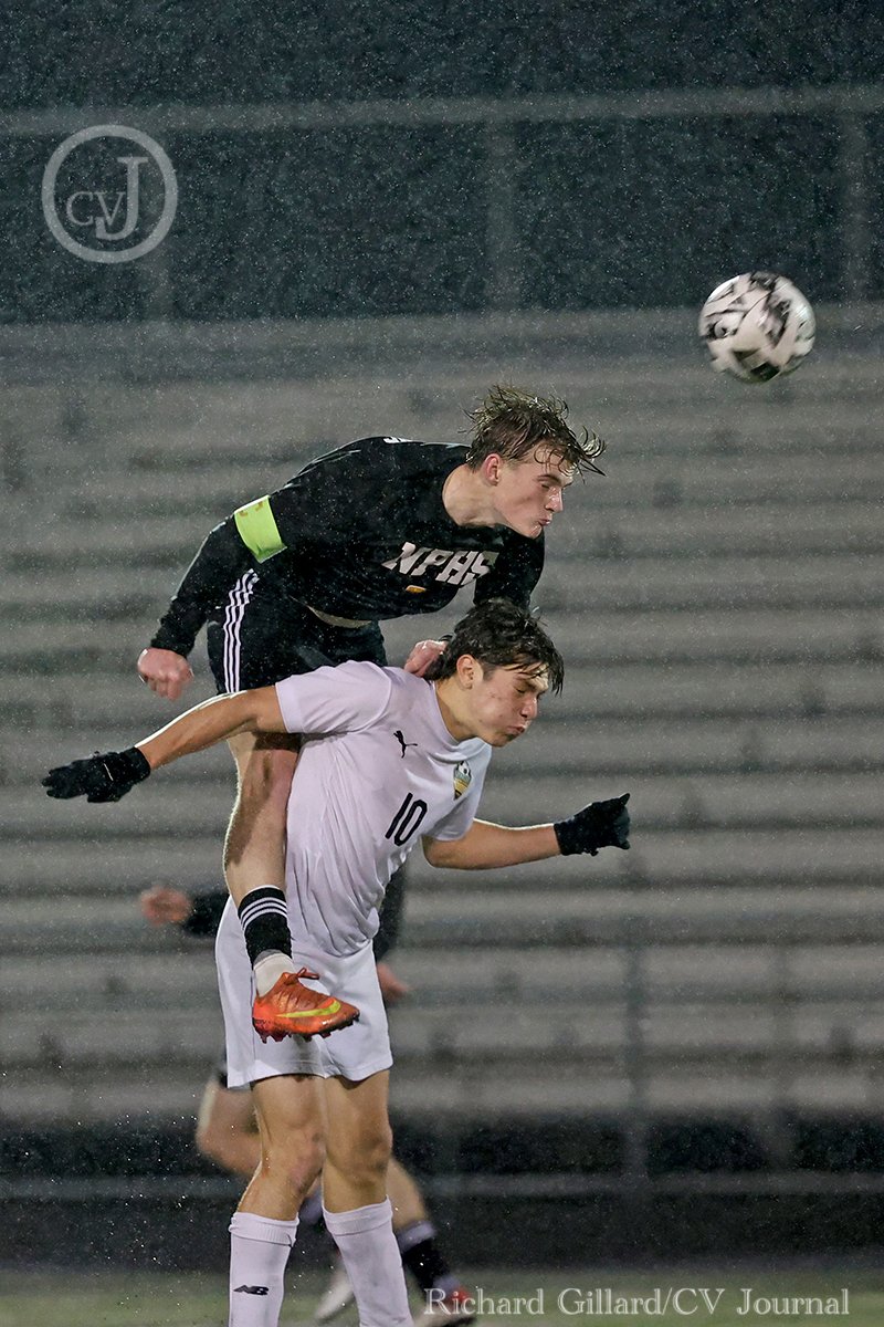 Newbury Park senior Dragen Vrataric and Thousand Oaks senior Gabriel Torreblanca jump to heads the ball during their conference game on Tuesday, February 4, 2025. Thousand Oaks won 4-1. [Richard Gillard/Conejo Valley Journal]