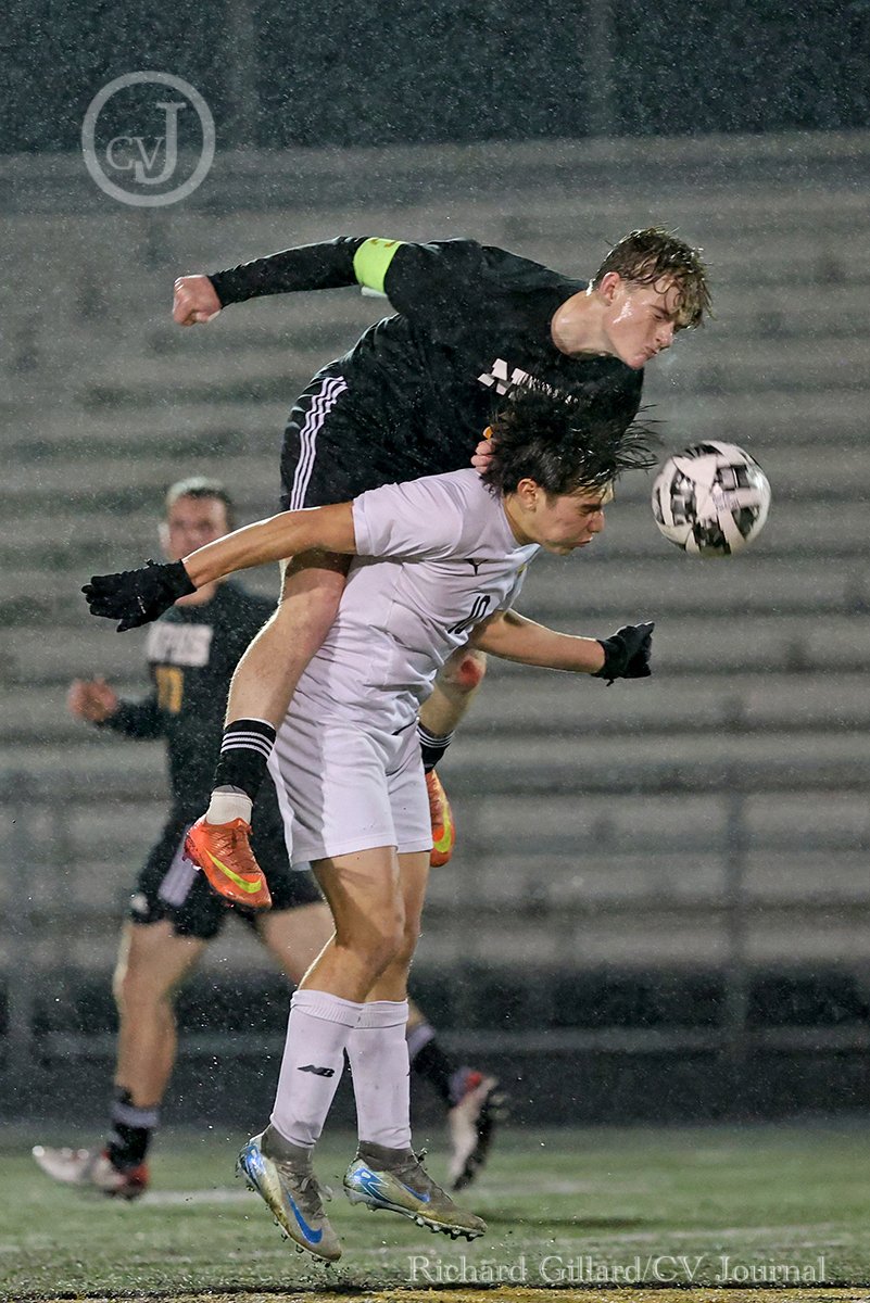 Newbury Park senior Dragen Vrataric and Thousand Oaks senior Gabriel Torreblanca jump to heads the ball during their conference game on Tuesday, February 4, 2025. Thousand Oaks won 4-1. [Richard Gillard/Conejo Valley Journal]