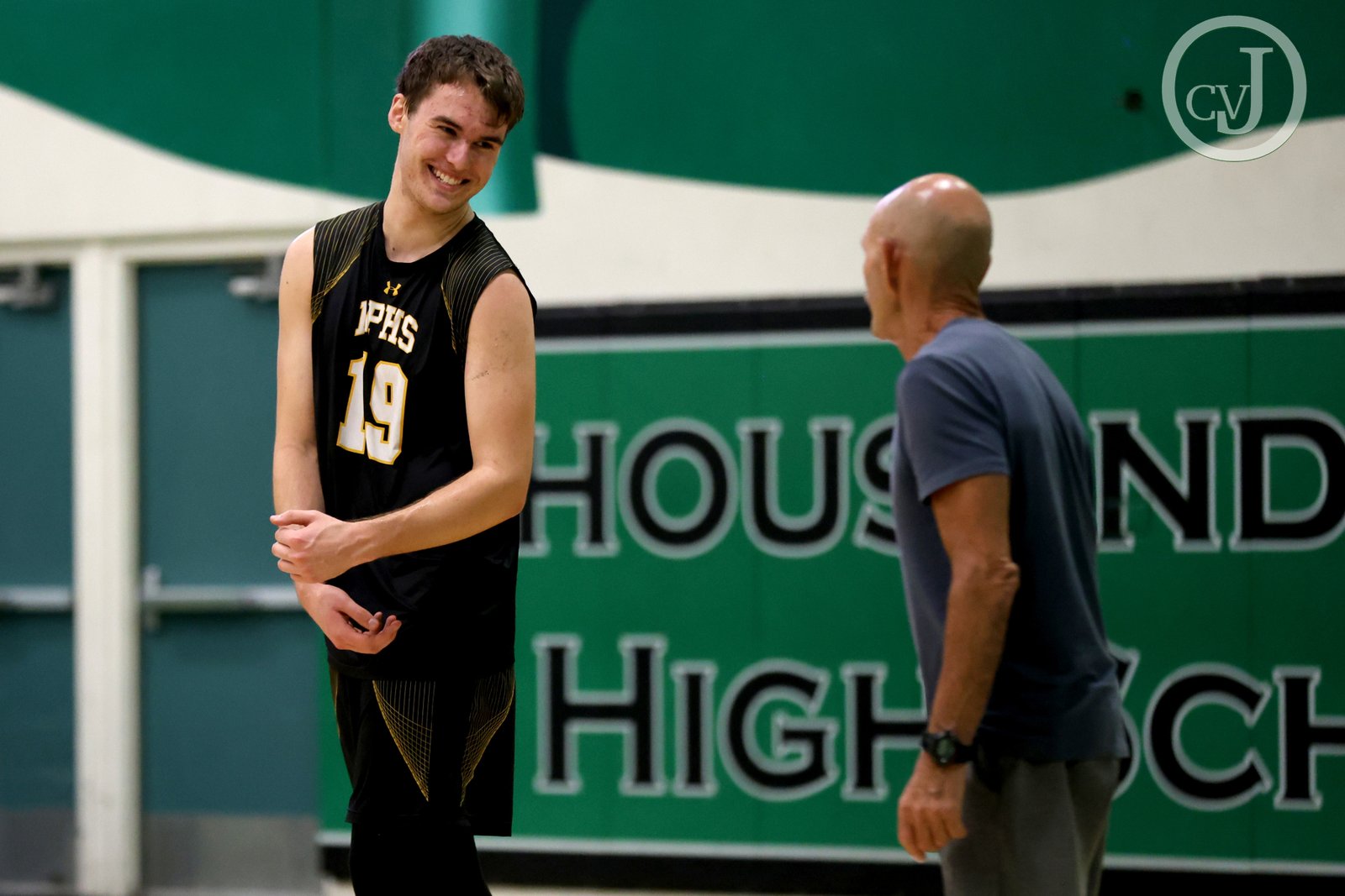 Newbury Park’s Celeb Eschenberg smiles at Coach Jorge Ostrovsky during their last conference match against Thousand Oaks on Wednesday, April 16, 2025. Thousand Oaks won 3-0. [Richard Gillard/Conejo Valley Journal]
