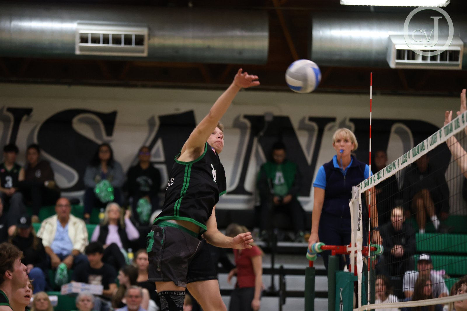 Thousand Oaks’ Bryson Saint spikes the ball during their last conference match against Newbury Park on Wednesday, April 16, 2025. Thousand Oaks won 3-0. [Richard Gillard/Conejo Valley Journal]