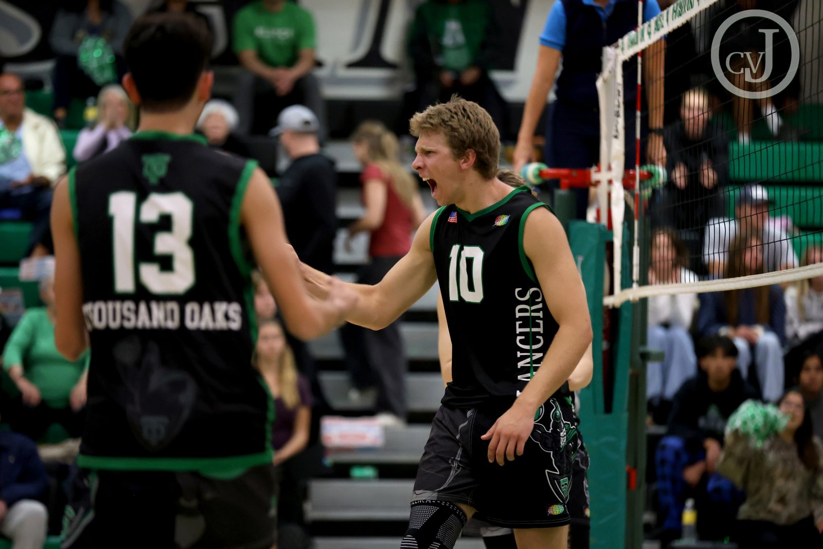 Thousand Oaks’ Bryson Saint cheers after spiking the ball during their last conference match against Newbury Park on Wednesday, April 16, 2025. Thousand Oaks won 3-0. [Richard Gillard/Conejo Valley Journal]