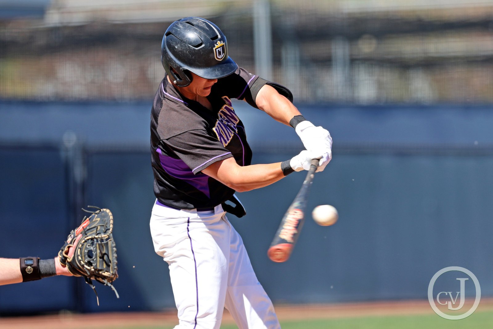 Kingsmen Jona Dawson hits the ball during their first game in their double header against Bridgewater (Va.) on Saturday, March 1 at California Lutheran University’s George “Sparky” Anderson Field. Bridgewater won both games (8-6) and (10-5) remaining undefeated.