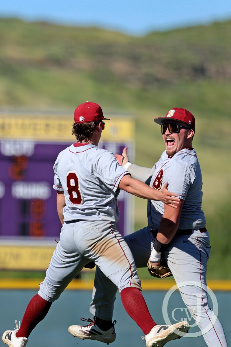 Eagles’ Nick Stavros and Ashton Smith jump in the air and share a hi-5 after beating the Kingsmen during their first game in their double header on Saturday, March 1 at California Lutheran University’s George “Sparky” Anderson Field. Bridgewater (Va.) won both games (8-6) and (10-5) remaining undefeated.