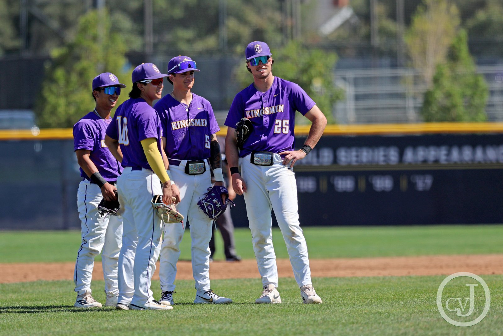 Kingsmen Kai Caranto, Philip Jeong, Wyatt Crosby, and Troy Anderson talk while pitcher Caleb Wilson warms up during a doubleheader against Willamette (Or) on Saturday, March 14 at California Lutheran University’s George “Sparky” Anderson Field. Willamette Bearcats won the first game (6-1) and CLU Kingmen won second game (13-6).